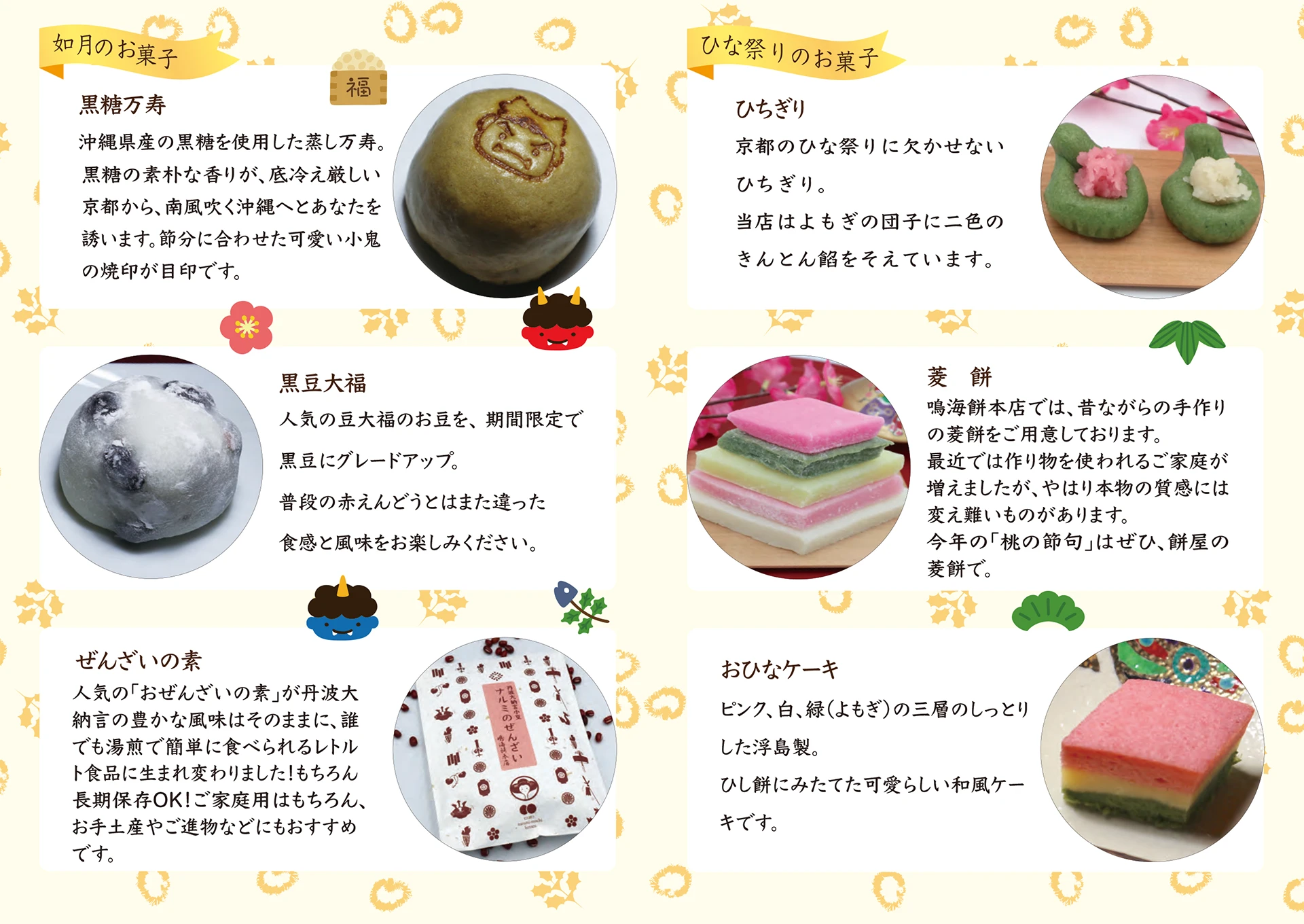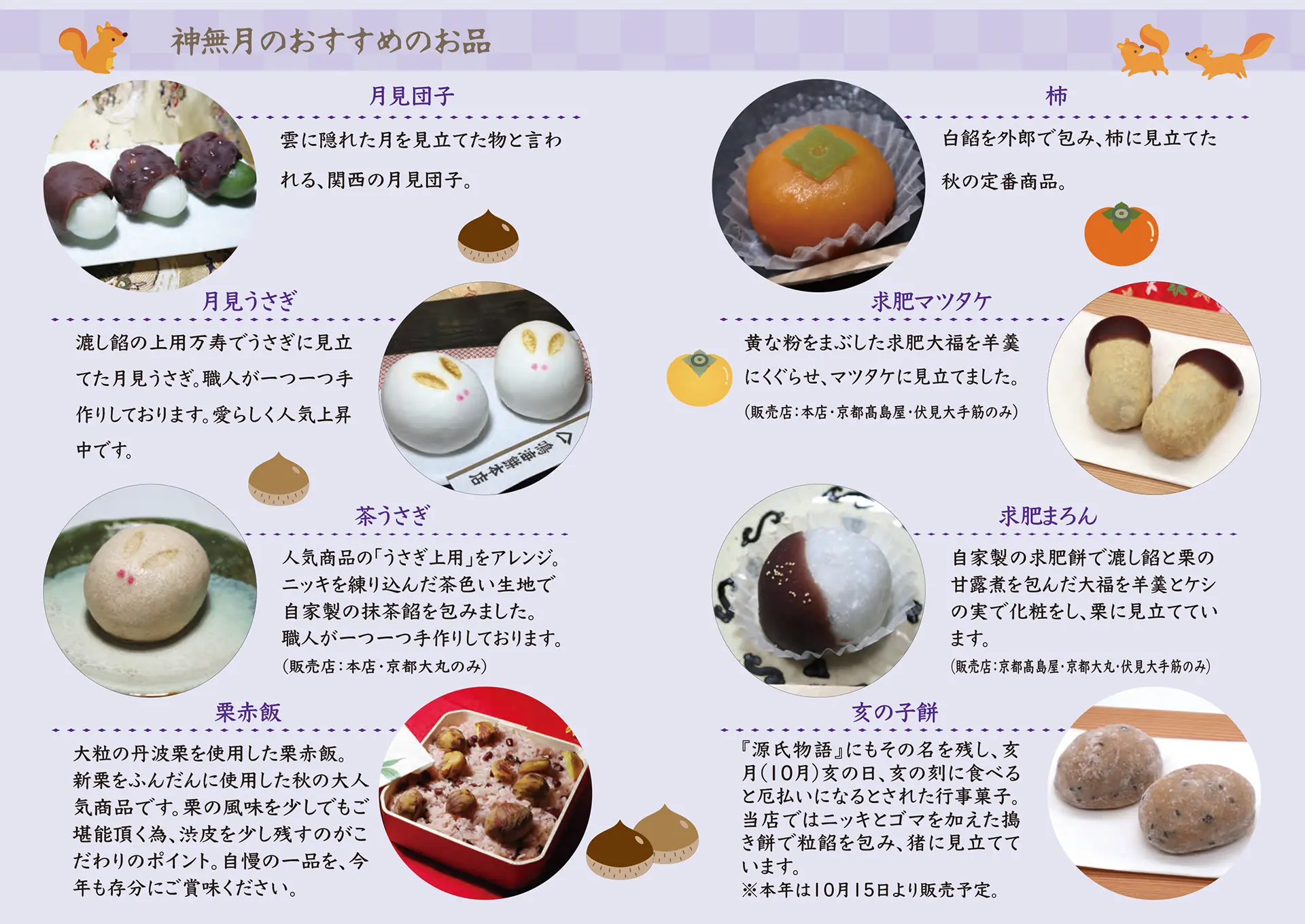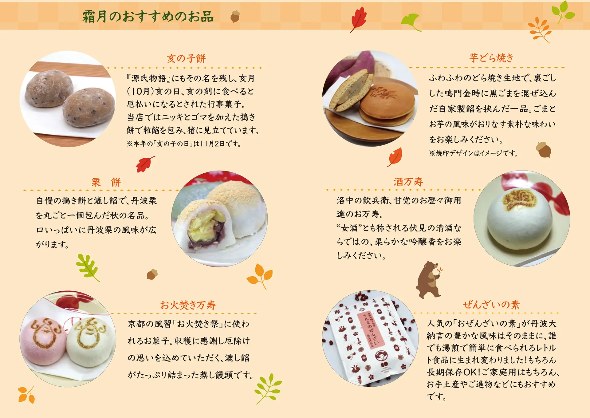 明治8年(1875年)に商いを始め本年、お陰様で150周年を迎えます。 この間、地域に根差し京都の歳時記に沿った商いを続けて参れましたのも、ひとえに地域の皆様はもとより多くの方々のお引き立ての賜物と心より厚く御礼申し上げます。 平安京以降京都には様々な文化が生まれ脈々と受け継がれてきています。それら文化的要素と季節感を大切に京都の食文化を発信して参ります。今後ともお引き立て賜りますよう、心よりお願い申し上げる次第でございます。
