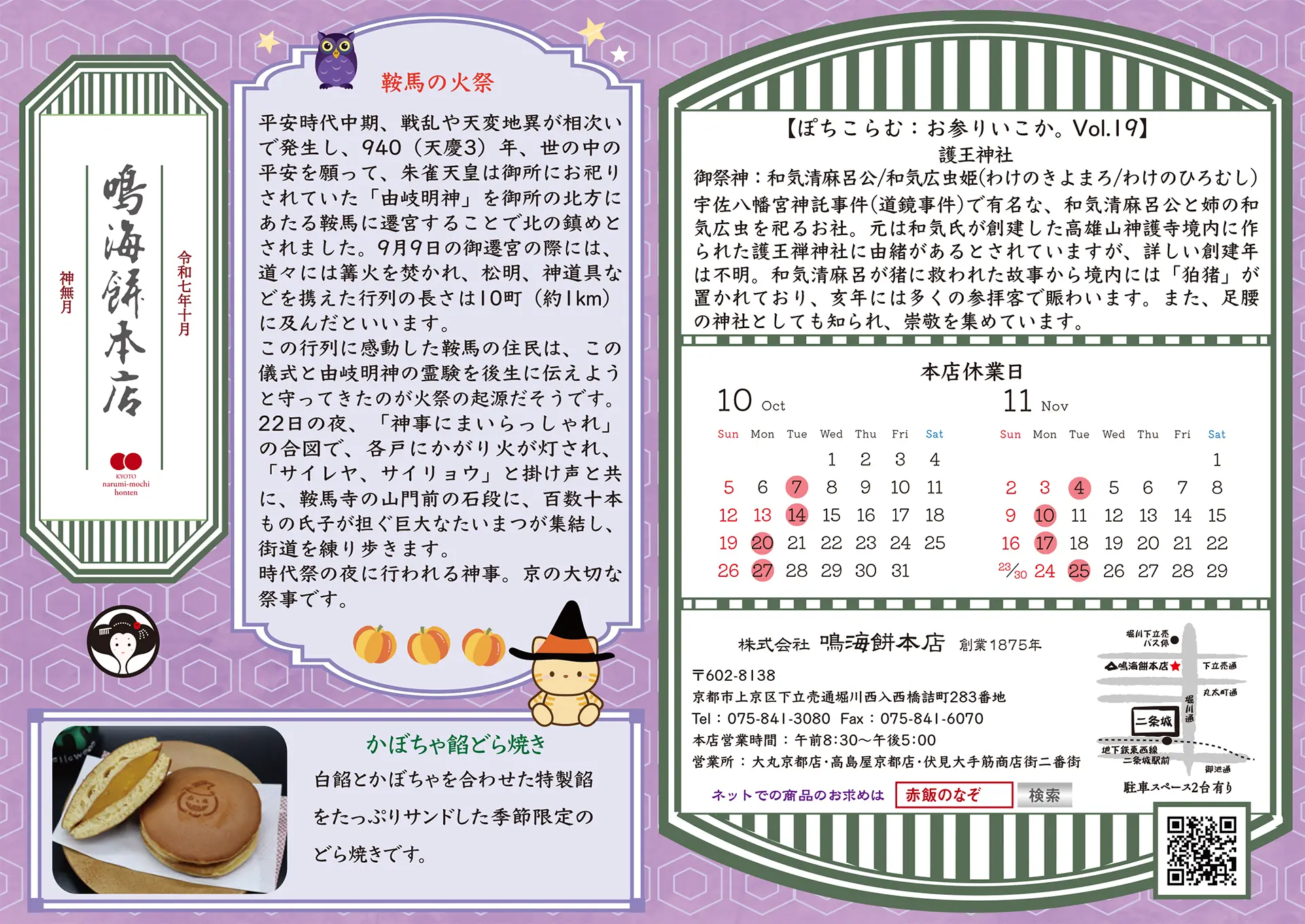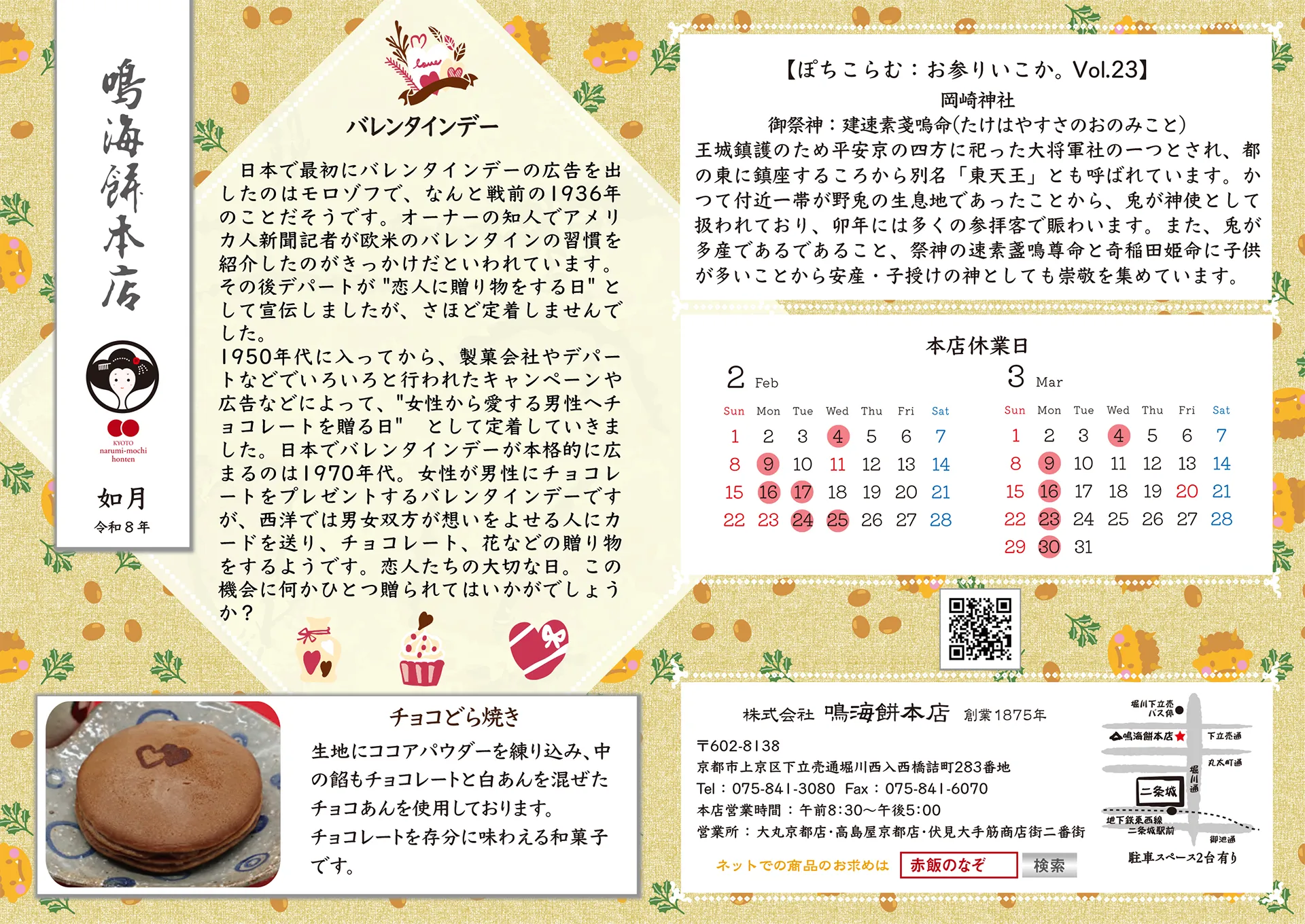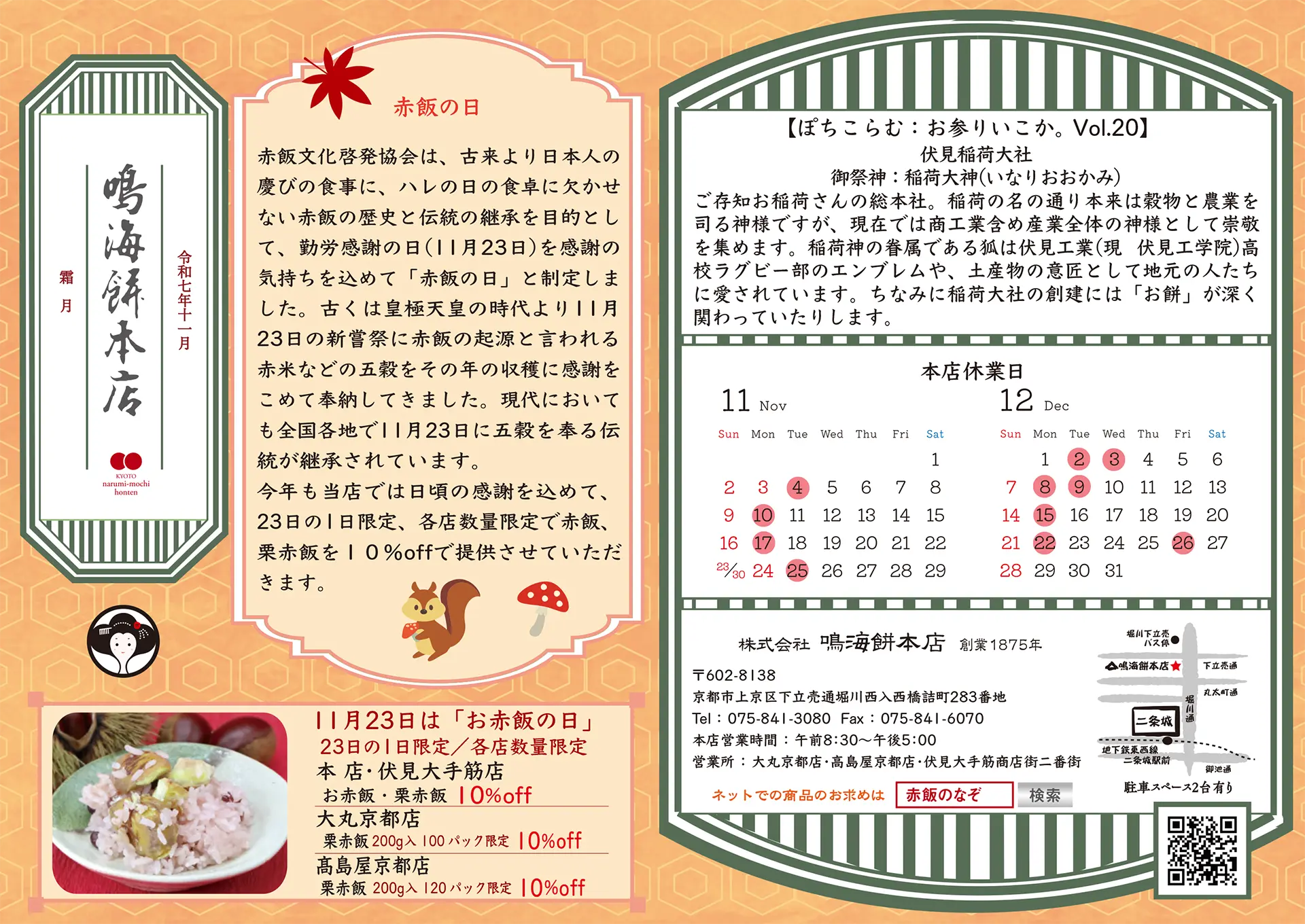 明治8年(1875年)に商いを始め本年、お陰様で150周年を迎えます。 この間、地域に根差し京都の歳時記に沿った商いを続けて参れましたのも、ひとえに地域の皆様はもとより多くの方々のお引き立ての賜物と心より厚く御礼申し上げます。 平安京以降京都には様々な文化が生まれ脈々と受け継がれてきています。それら文化的要素と季節感を大切に京都の食文化を発信して参ります。今後ともお引き立て賜りますよう、心よりお願い申し上げる次第でございます。